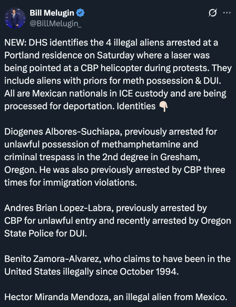 FBI Says Four Men Arrested in Portland for Shining Laser at Border Patrol Helicopter Are Illegal Aliens