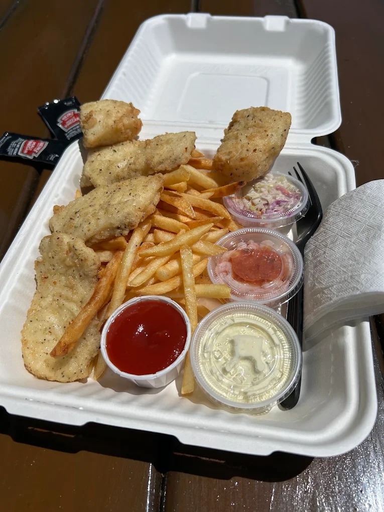 Inside, the seafood is the star. Everything is sourced locally whenever possible. The fish is fresh. The batter is made in-house. There’s no attempt to overcomplicate what works. The result is the kind of fish and chips that makes you pause after the first bite.