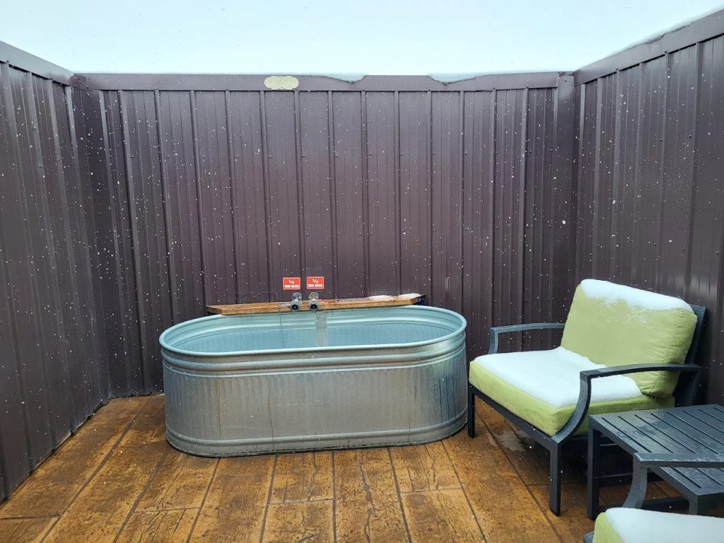 When Danielle and I stayed here back in 2016, we booked the teepee with the you-fill hot tub right in the center. It was such a unique experience. Imagine stepping inside a large canvas teepee, with a queen bed set up and a wooden tub right in the middle that you fill yourself with hot spring water.