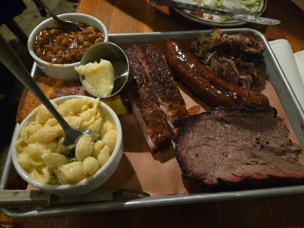 The sides deserve equal attention. Potato salad, coleslaw, Texas Caviar made from black-eyed peas, BBQ beans, collard greens, green chile mac and cheese, cornbread, and side wedge salads ensure there is something for every preference. The green chile mac and cheese in particular brings a subtle kick that balances creamy richness with gentle heat. The collard greens lean traditional, and the cornbread provides a slightly sweet companion to smoky meats.
