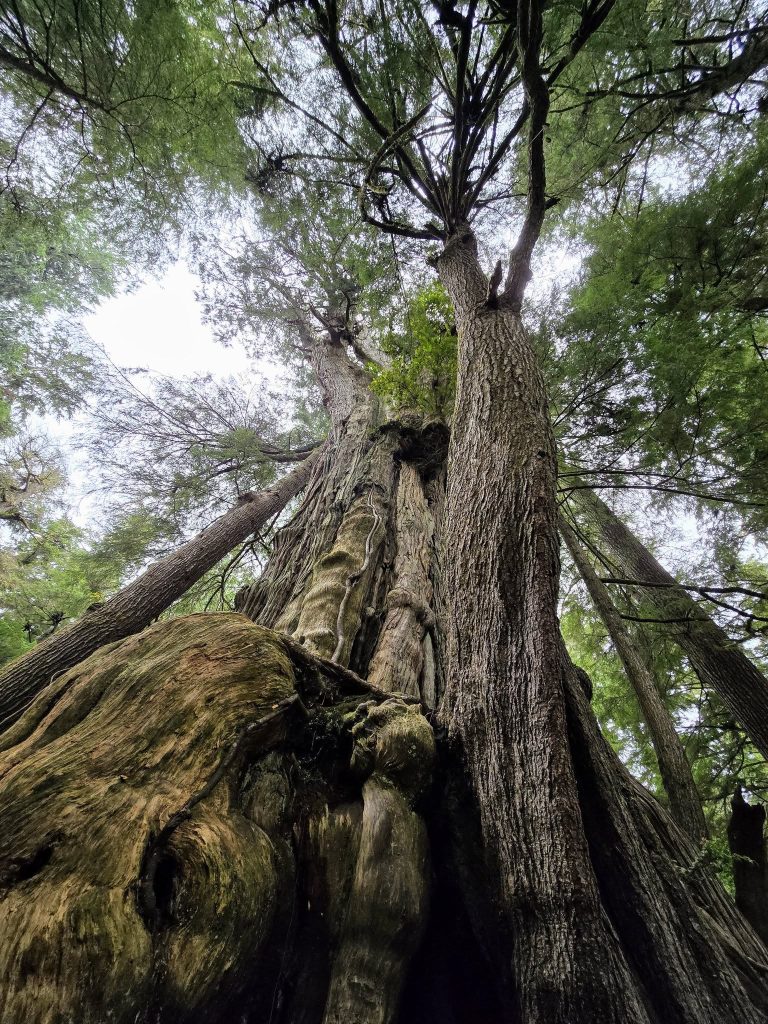 The bark is thick and gnarled, folded into deep ridges that look more like sculpted stone than wood. Standing at its base, craning your neck upward, it’s hard to fully understand what you’re looking at. Photos don’t help. Scale disappears in pictures. You have to be there, feeling how small you are beside something that’s been growing for 500 to 900 years.