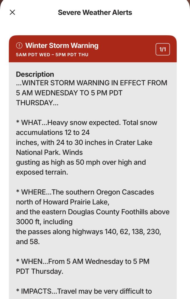According to reporting from OPB, a winter storm warning is now in effect from Wednesday morning through Thursday night, bringing heavy snow and strong winds to much of the Oregon Cascades and nearby foothills.