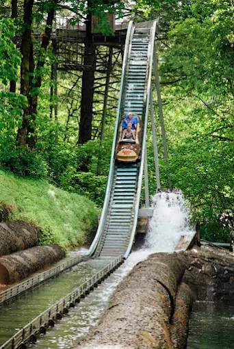 The ride itself is something special. It’s not just a log flume—it’s a mix of a log ride and a roller coaster, weaving through a rustic logging mill before climbing up into the trees.